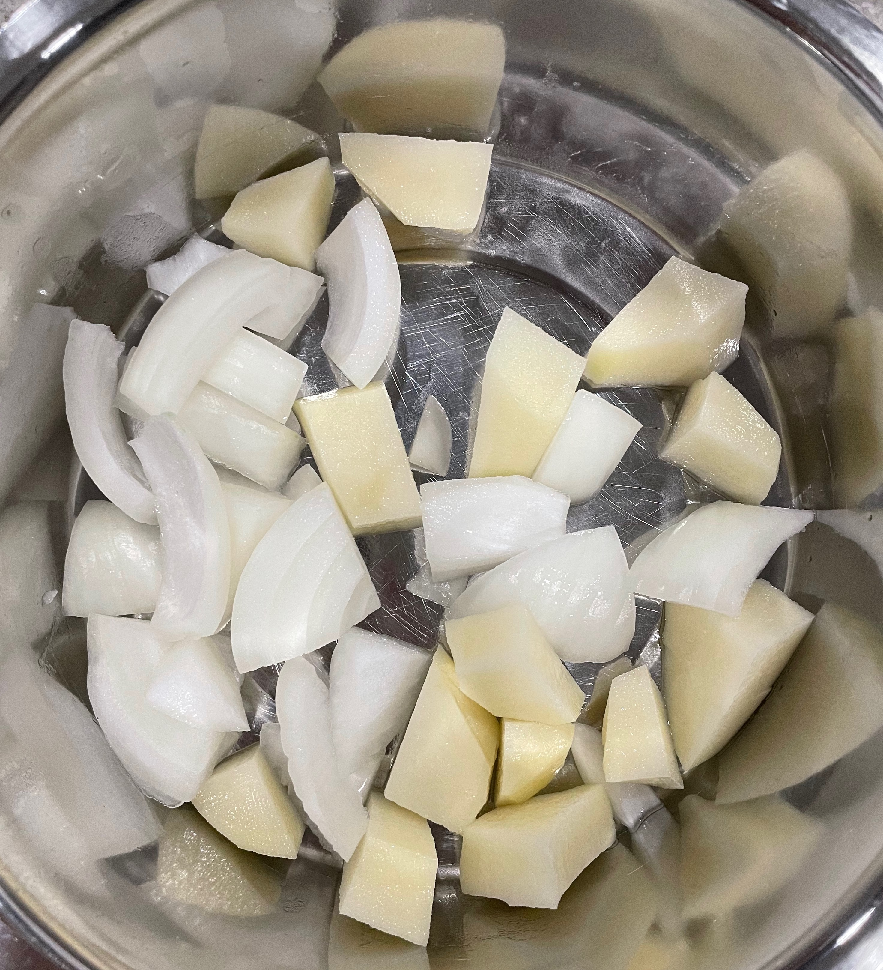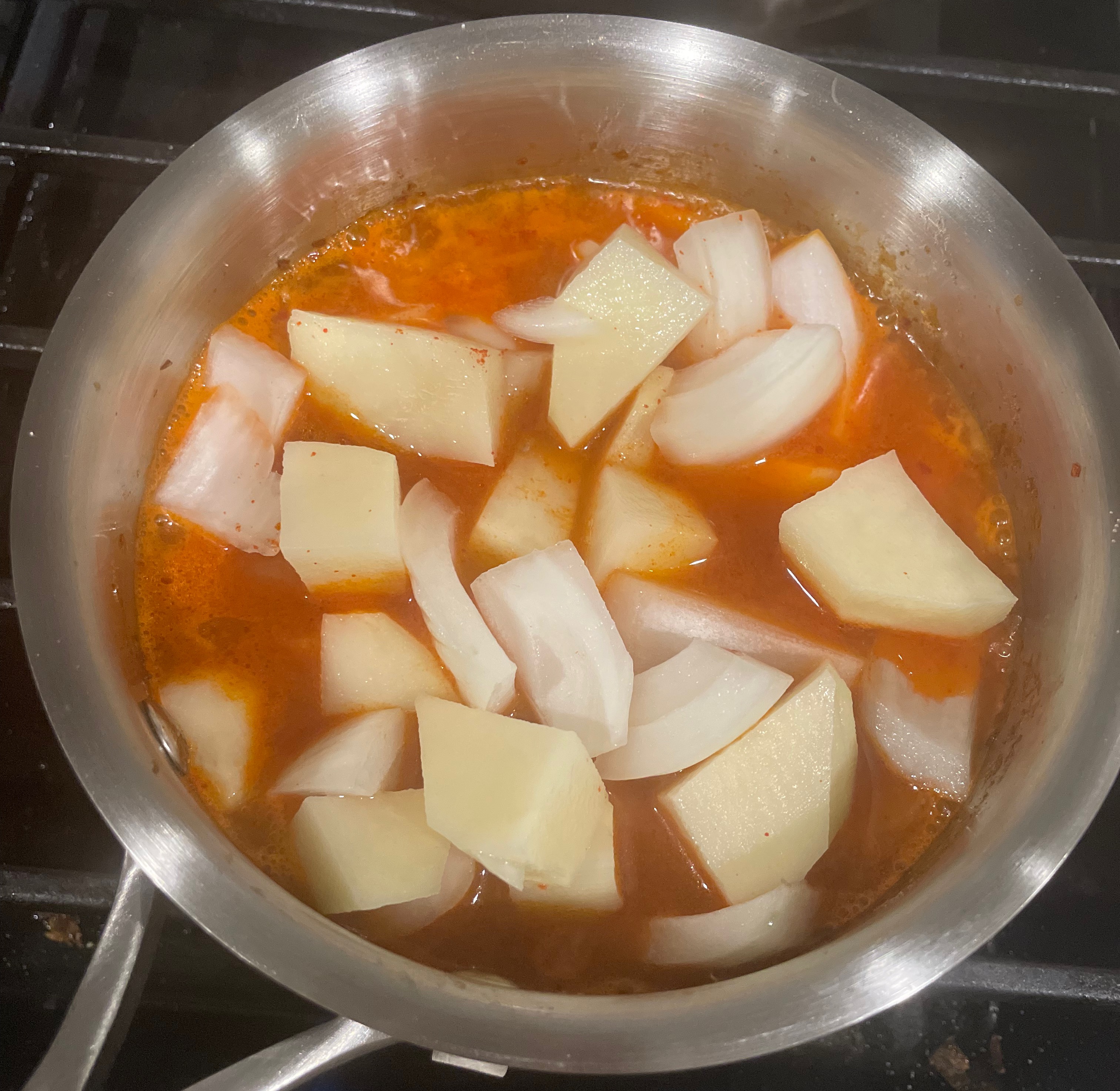 4) 이제 남은 재료 투하! 양파, 감자를 넣고, 마늘은 다진 마늘 있으면 넣고 없으면 안넣고