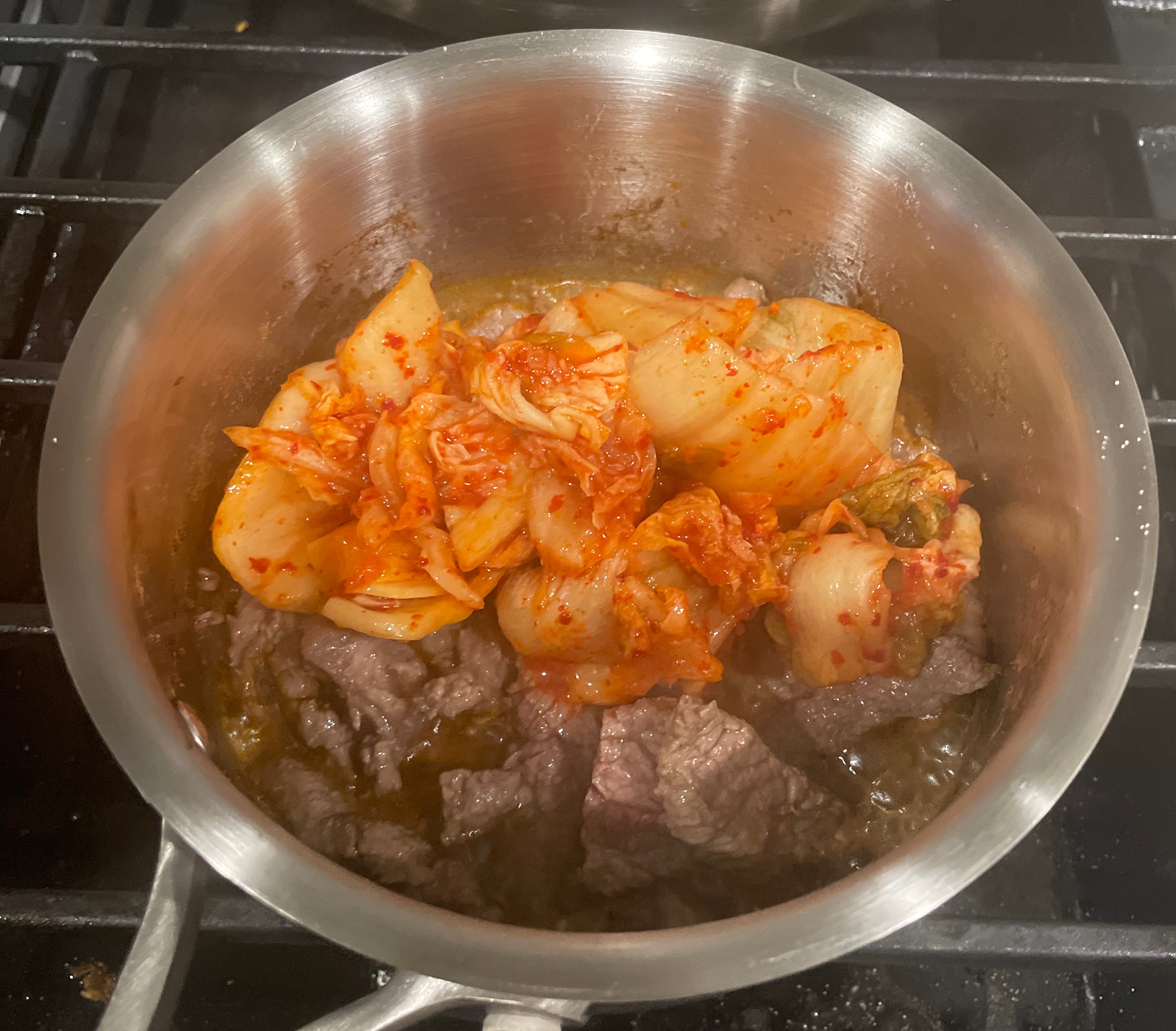 2) 김치를 잘게 썰어서 투하! 살짝 볶으면서 물을 자작하게 넣어주기