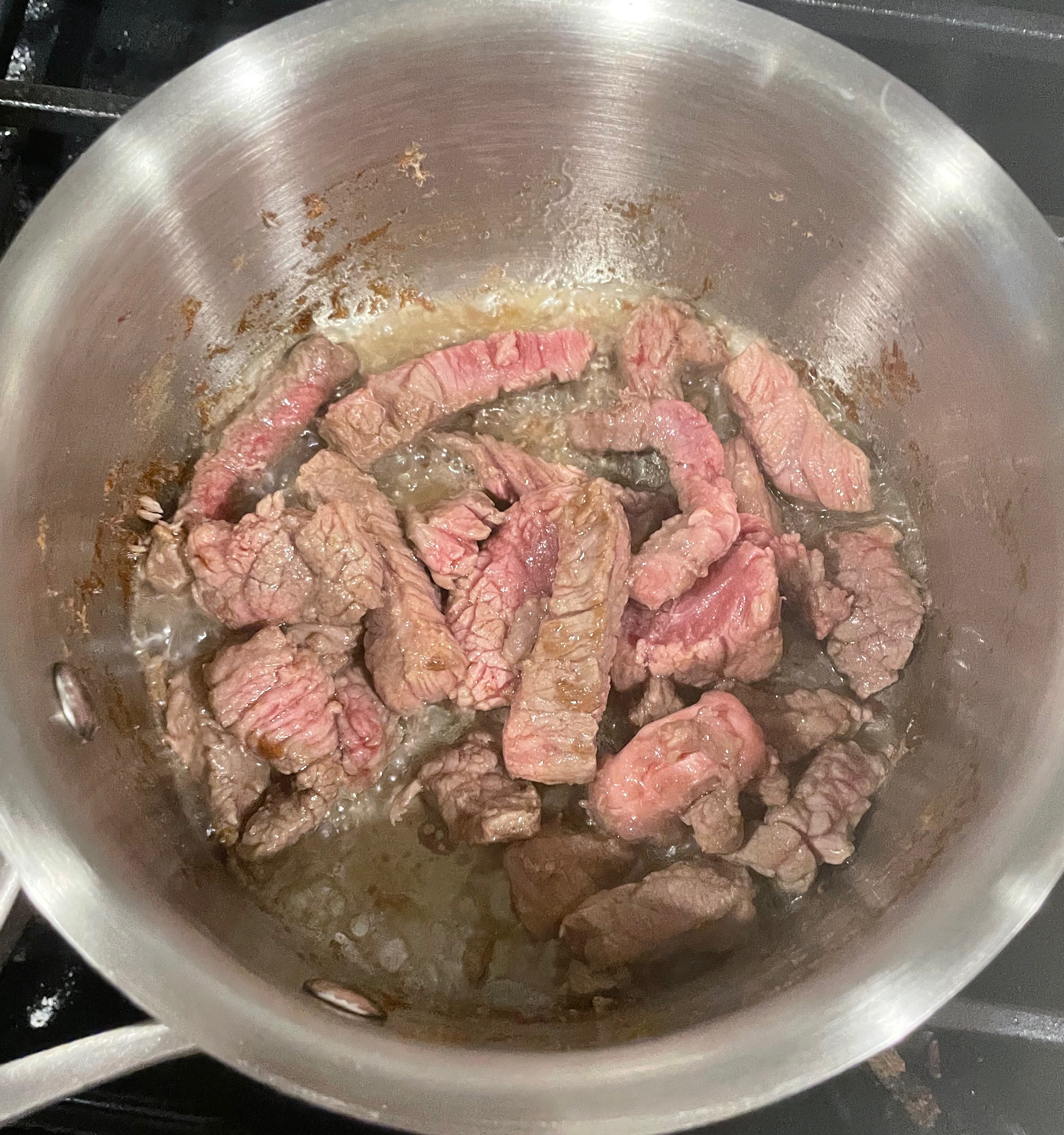 1) 소고기를 먹기 좋게 썰어서 먼저 볶기. 볶을 때 소금으로 살짝 간을 해주기.(소금 1T스푼 정도)